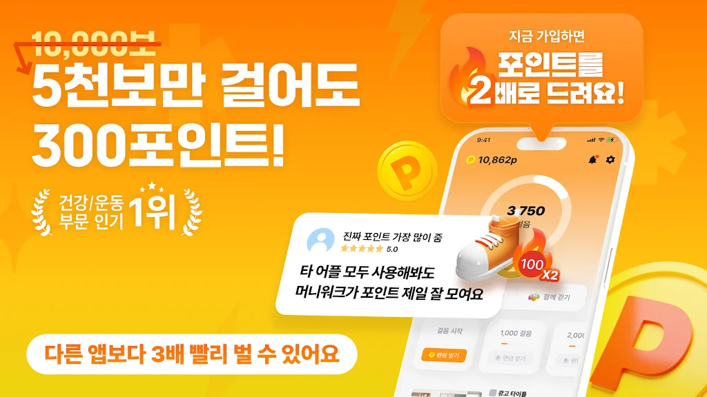 - 걷기만 해도 포인트 주는 만보기 와 함께 성취감을 느껴보세요!