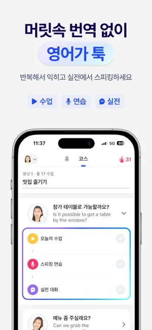 AI 실시간 음성인식으로 배운 단어와 문장을 암기하지 않고도 술술 나올 때까지 무제한 영어 스피킹!