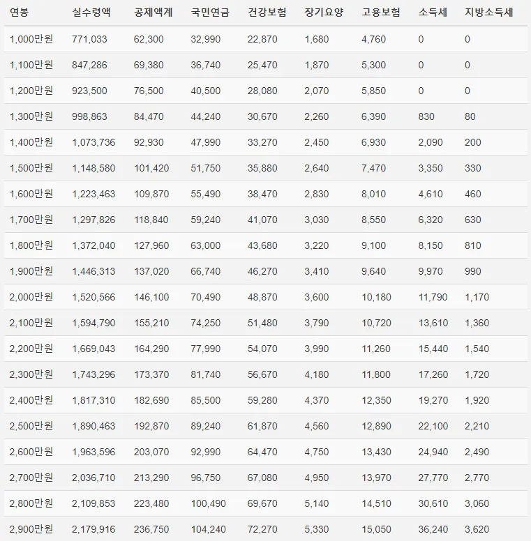 1. 연봉 1000만원~2900만원 일때 실수령액