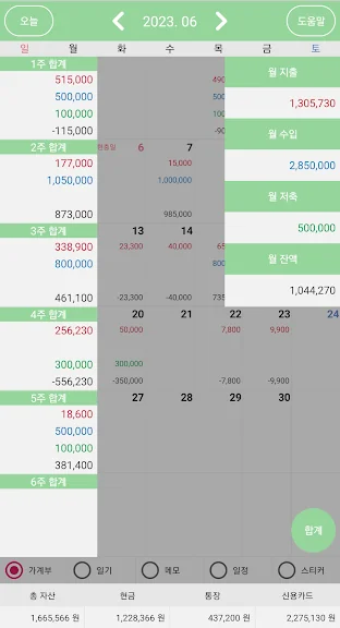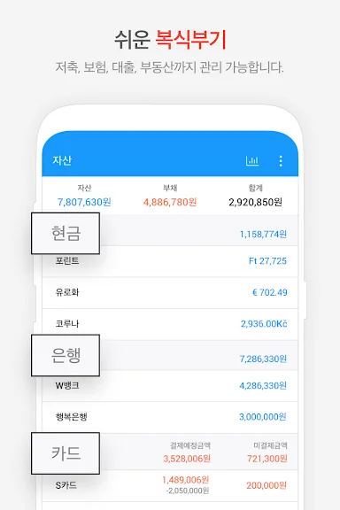 - 현금, 통장, 체크카드, 신용카드로 나눠서 자산을 관리할 수 있습니다.