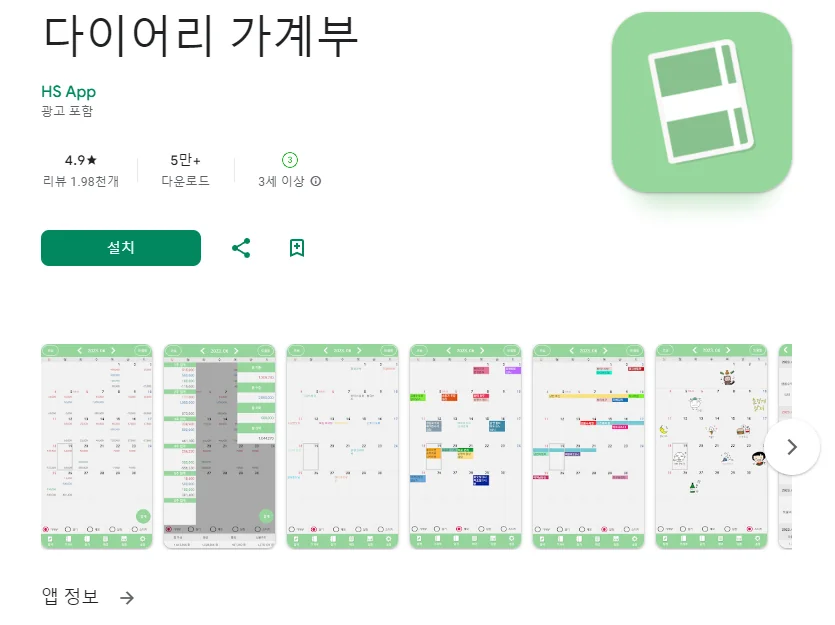 다이어리 가계부 어플에 대한 스크린샷 정보가 필요하시다면 아래 이미지를 참고하시기 바랍니다.