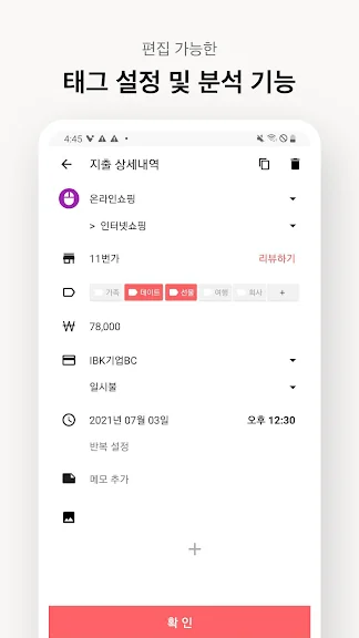 간단한 선택만으로 날짜와 금액, 내용, 계좌, 분류가 자동으로 분석되어서,