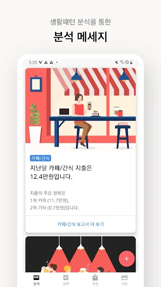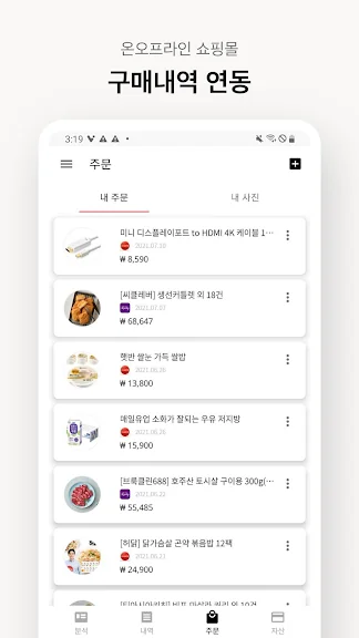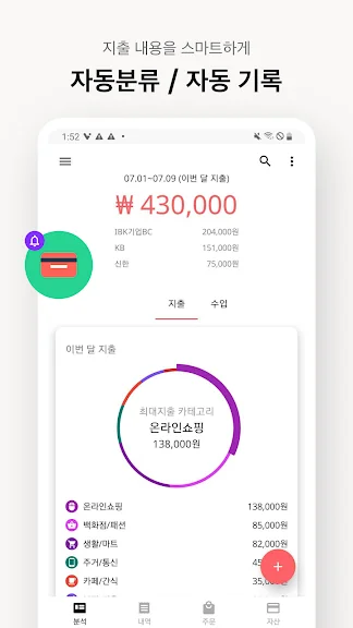 - 은행 및 카드회사 어플의 푸시 분석으로 내역을 입력할 수 있습니다.