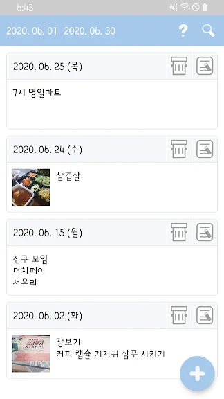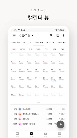 - 내역, 통계 화면 오른쪽 상단의 돋보기 모양 버튼을 눌러서 보고싶은 데이터를 검색할 수 있습니다.