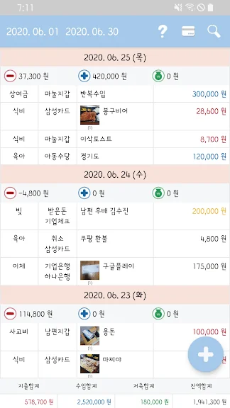- 신용카드는 사용기간, 결제일, 연결통장으로 관리하고, 카드대금결제 입력으로 쌓인 카드대금을 차감할 수 있습니다.