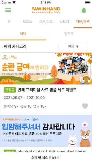 ▶ 포인핸드에서 입양하려 자주 보고있습니다! 반액이 기부되는 굿즈들과 아이들의 스토리 또한 볼수있는 기능들이 너무 좋네요:) 다만 가끔 앱에 오류가 발생해서 그 부분만 개선되면 좋겠습니다:) 항상 힘내시고 좋은 어플 감사드립니다☺️