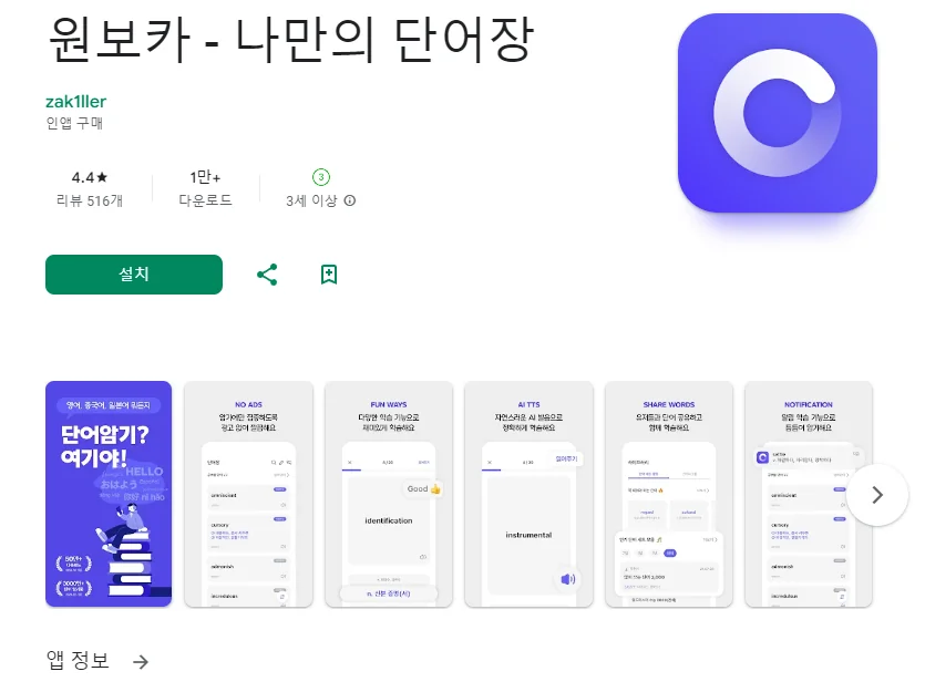 이 어플은 구글플레이스토어에서 "영단어 암기"로 검색했을때 4번째로 나오는 어플입니다. 아래는 원보카 - 나만의 단어장 어플에 대한 자세한 설명이니 참고하세요.