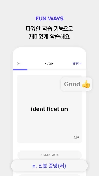 • 카드를 넘기며 아는 단어와 모르는 단어를 확인할 수 있어요.