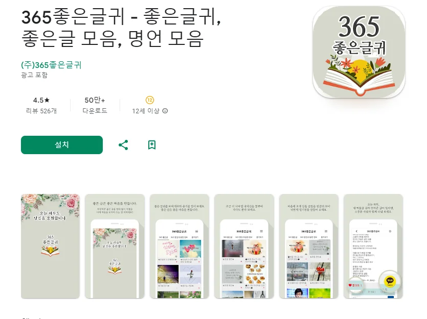 이 어플은 구글플레이스토어에서 "좋은 글귀"로 검색했을때 1번째로 나오는 어플입니다. 아래는 365좋은글귀 - 좋은글귀, 좋은글 모음, 명언 모음 어플에 대한 자세한 설명이니 참고하세요.