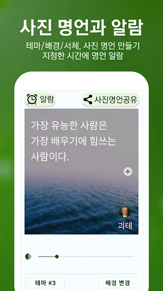 - '명언 알람'(글귀 설정 및 알람소리, 진동, 무음, 알람음, 알람음 크기, 스누즈 옵션 지정가능)