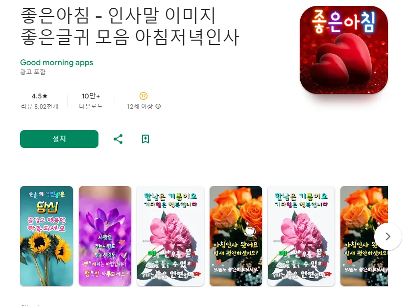 이 어플은 구글플레이스토어에서 "좋은 글귀"로 검색했을때 3번째로 나오는 어플입니다. 아래는 좋은아침 - 인사말 이미지 좋은글귀 모음 아침저녁인사 어플에 대한 자세한 설명이니 참고하세요.