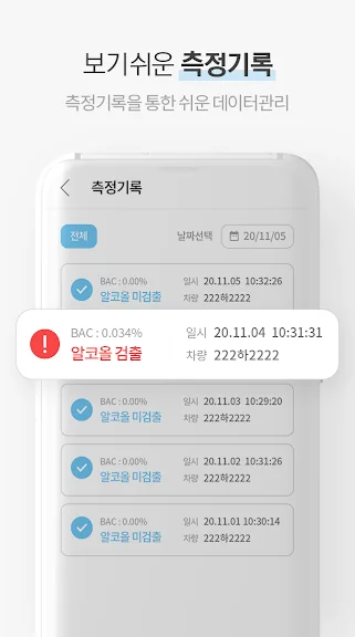 해당 앱은 휴대용 측정 장비와 연동하여 음주 측정 데이터를 수집합니다.