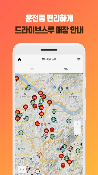 운전하다 졸리면 커피 한 잔, 배고프면 간단히 햄버거라도 먹고 싶은데 주차 문제로 고민이던 어려움을 해소할 수 있습니다. 지도에 보이는 매장을 클릭한 번으로 길 안내까지 받을 수 있습니다.