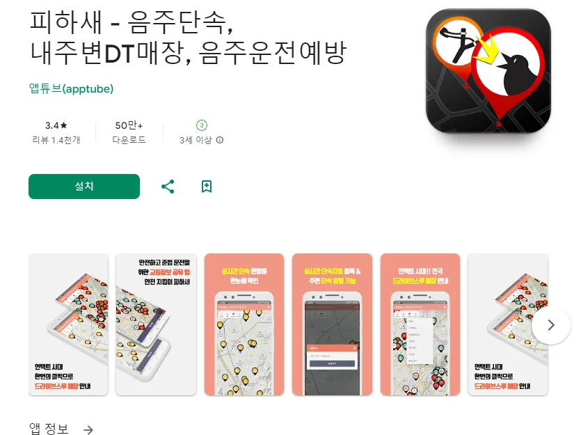 이 어플은 구글플레이스토어에서 "음주운전 단속"로 검색했을때 2번째로 나오는 어플입니다. 아래는 피하새 - 음주단속, 내주변DT매장, 음주운전예방 어플에 대한 자세한 설명이니 참고하세요.