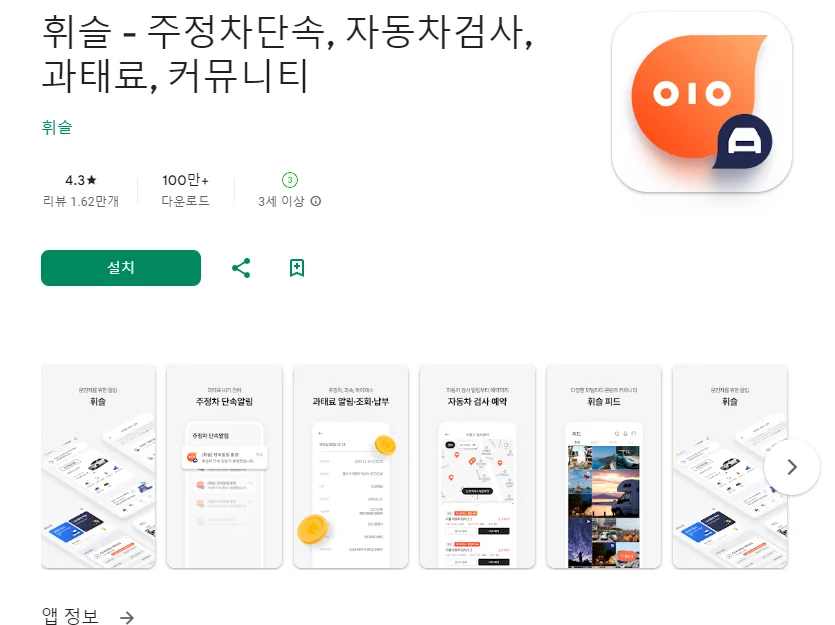 아래는 휘슬 - 주정차단속, 자동차검사, 과태료, 커뮤니티 어플에 대한 스크린샷 정보입니다.