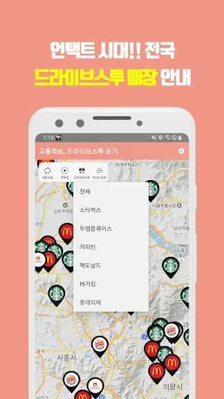 - 드라이브 스루 : 전국 드라이브 스루 매장 조회(스타벅스, 투썸플레이스, 커피빈, 맥도날드, 롯데리아, 버커킹 등)