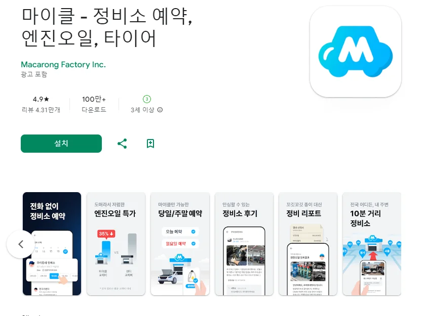이 어플은 구글플레이스토어에서 "차량관리"로 검색했을때 1번째로 나오는 어플입니다. 아래는 마이클 - 정비소 예약, 엔진오일, 타이어 어플에 대한 자세한 설명이니 참고하세요.