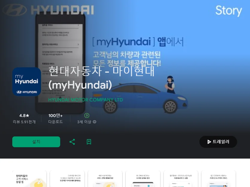 이 어플은 구글플레이스토어에서 "차량관리"로 검색했을때 4번째로 나오는 어플입니다. 아래는 현대자동차 - 마이현대 (myHyundai) 어플에 대한 자세한 설명이니 참고하세요.