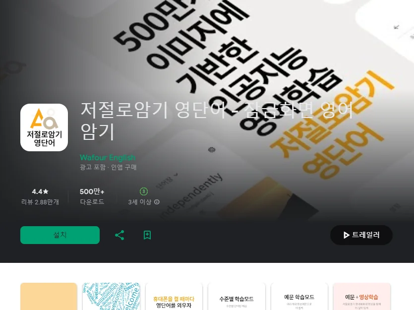 이 어플은 구글플레이스토어에서 "암기 잘하는 방법"로 검색했을때 4번째로 나오는 어플입니다. 아래는 저절로암기 영단어 - 잠금화면 영어 암기 어플에 대한 자세한 설명이니 참고하세요.