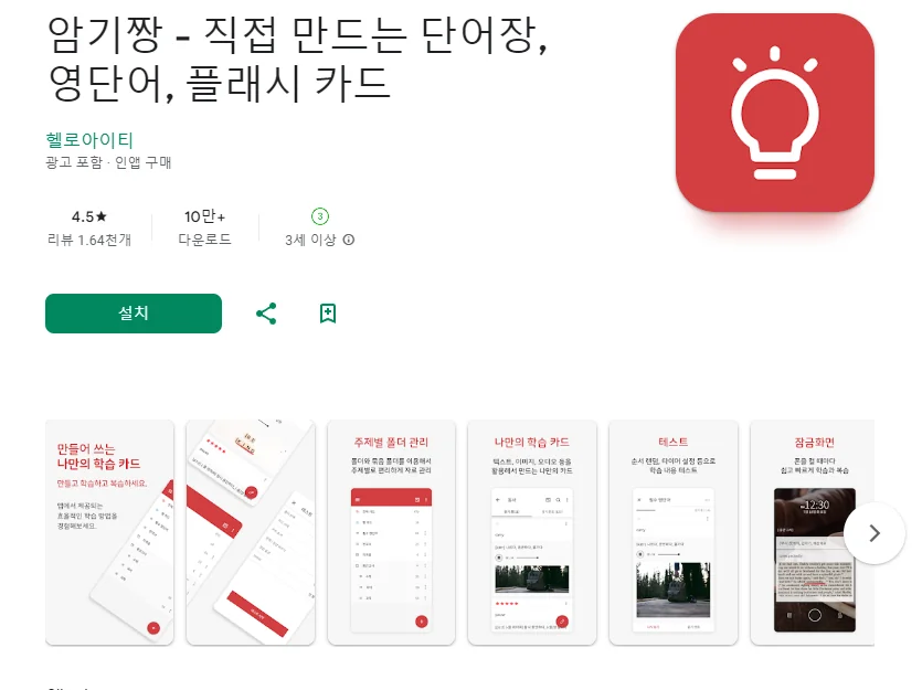 암기짱 - 직접 만드는 단어장, 영단어, 플래시 카드 어플에 대한 스크린샷 정보가 필요하시다면 아래 이미지를 참고하시기 바랍니다.