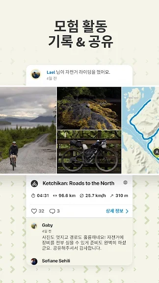 GPS를 이용하여 러닝, 라이딩, 사이클링, 하이킹을 추적해보세요. 사진, 하이라이트, 팁을 추가하고 나만의 운동 기록을 모으면 좋아하는 경험을 평생 간직할 수 있답니다. 개인적인 용도로 저장해도 좋고, komoot 커뮤니티에 공유해서 ‘좋아요’와 댓글을 받고 다른 여행자가 다음 여행 계획을 세우는데 영감을 주는 것도 좋아요. 친구들과 마음이 잘 맞는 모험가를 팔로우하여 그들의 최근 모험을 확인해보세요.
