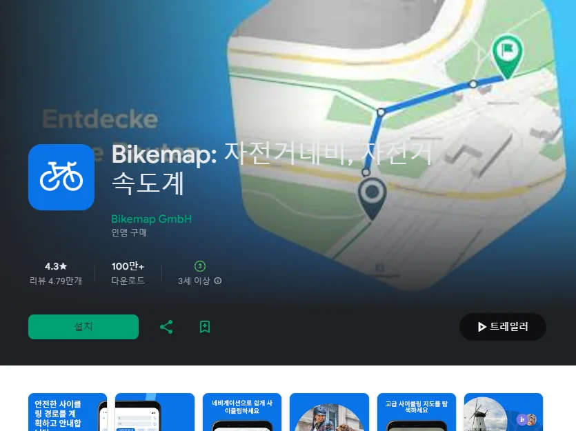 이 어플은 구글플레이스토어에서 "자전거 내비게이션"로 검색했을때 1번째로 나오는 어플입니다. 아래는 Bikemap: 자전거네비, 자전거 속도계 어플에 대한 자세한 설명이니 참고하세요.