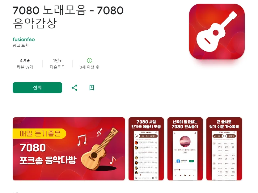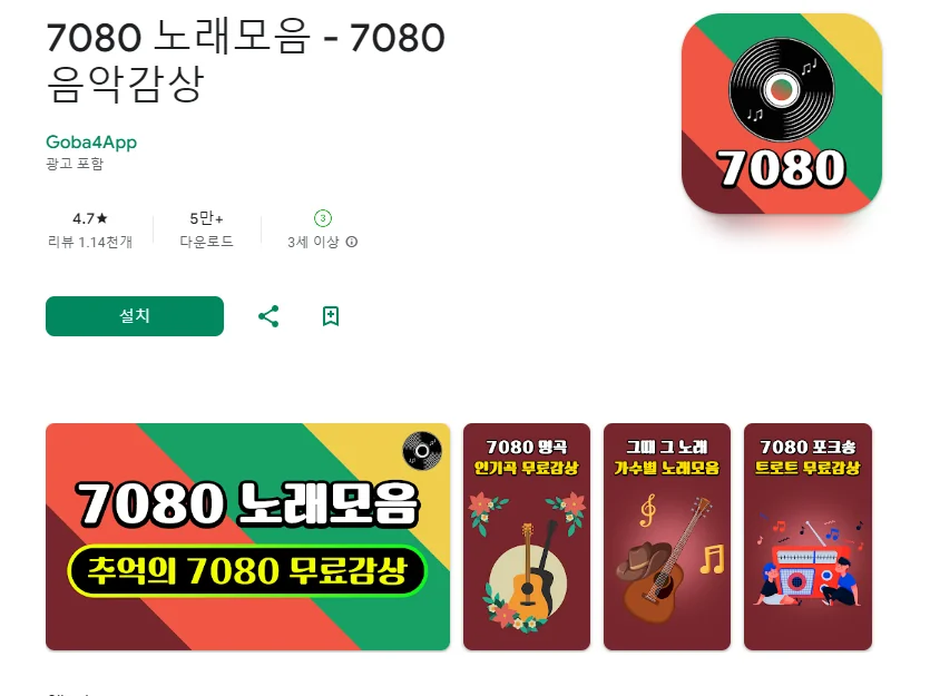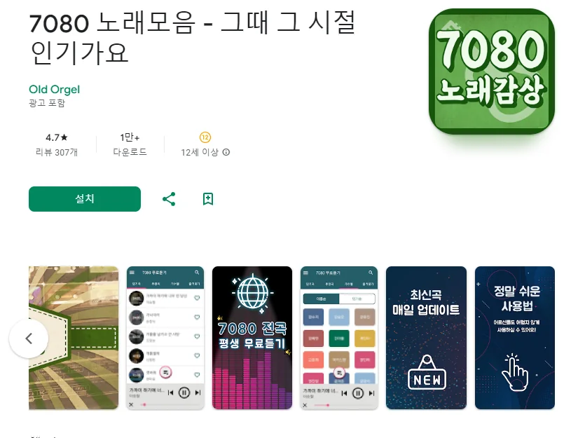 이 어플은 구글플레이스토어에서 "7080 노래모음"로 검색했을때 4번째로 나오는 어플입니다. 아래는 7080 노래모음 - 7080 음악감상 어플에 대한 자세한 설명이니 참고하세요.