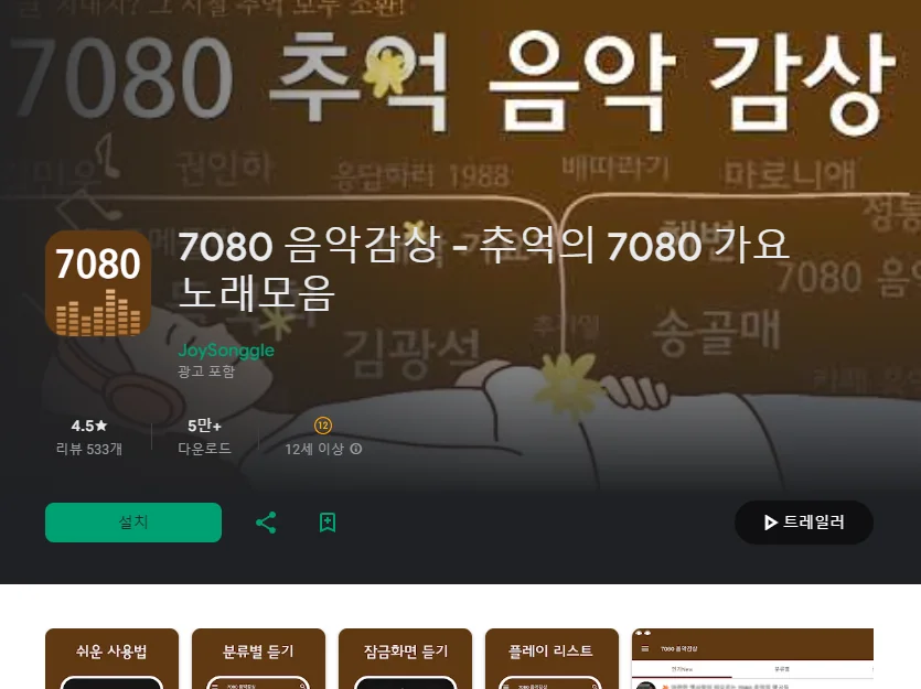 이 어플은 구글플레이스토어에서 "7080 노래모음"로 검색했을때 2번째로 나오는 어플입니다. 아래는 7080 음악감상 - 추억의 7080 가요 노래모음 어플에 대한 자세한 설명이니 참고하세요.
