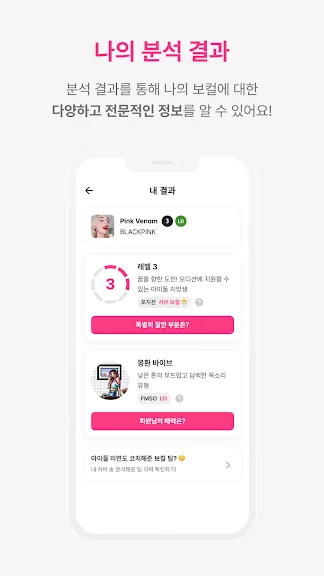 보컬 요소(음정, 템포, 비브라토, 리듬, 고음, 표현) 별 상세 분석과 성장 가능성, 목소리 유형에 대한 상세 설명(FMSO), 사용자와 동일한 목소리 유형의 아이돌 특징 등을 알 수 있습니다. 보컬 분석 체계는 케이팝 보컬 전문 코치들이 15년 이상 연구한 내용을 바탕으로 만들어졌습니다.