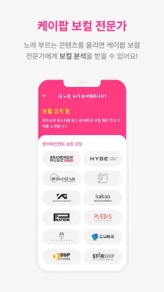 케이팝 아이돌이 소속되어 있는 유명 기획사의 아이돌 보컬 코치에게 케이팝 레슨을 받을 수 있습니다. 실제로 아이돌들이 받는 레슨 방식을 그대로 구현한 콘텐츠가 준비되어 있습니다.