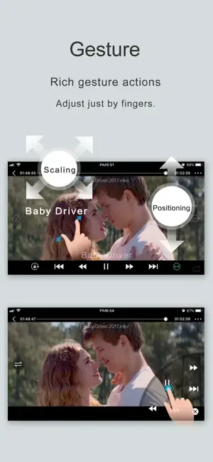 - Gesture: seek (forward, backward), brightness, volume, pause/resume, subtitle position and size