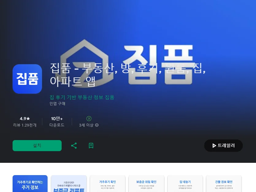 이 어플은 구글플레이스토어에서 "월세방"로 검색했을때 4번째로 나오는 어플입니다. 아래는 집품 - 부동산, 방, 후기, 원룸, 집, 아파트 앱 어플에 대한 자세한 설명이니 참고하세요.