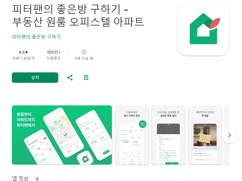 이 어플은 구글플레이스토어에서 "월세방"로 검색했을때 5번째로 나오는 어플입니다. 아래는 피터팬의 좋은방 구하기 - 부동산 원룸 오피스텔 아파트 어플에 대한 자세한 설명이니 참고하세요.