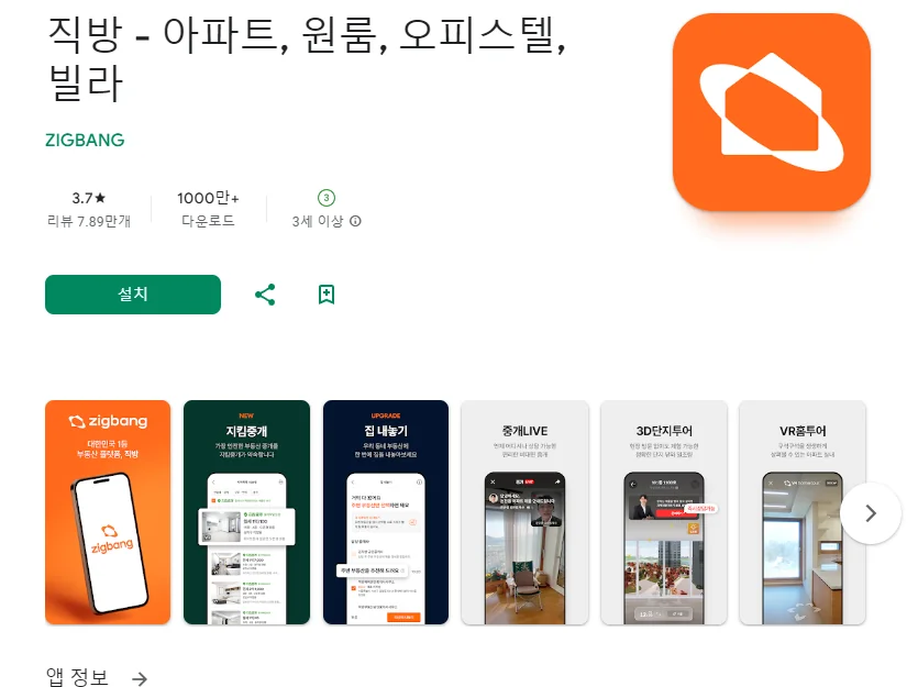 아래는 직방 - 아파트, 원룸, 오피스텔, 빌라 어플에 대한 스크린샷 정보입니다.