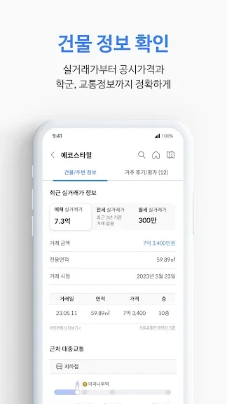 - 집 구하기 전세 월세 매매 정보, 거주 후기 리뷰 확인, 부동산 실거래가 학군 대중 교통 공원 버스 정보를 제공해요.