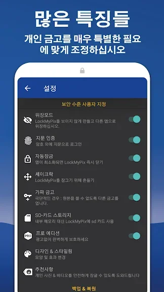 • 잠금 뒤에 숨겨진 모든 것 - 모든 사진들은 PIN, 패턴 또는 지문을 통해 보호됩니다.
