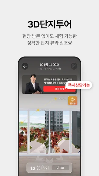 직방 비대면 중개라이브를 통해 시간대별 일조량과 입지, 주변 아파트 시세까지 언제 어디서나 편리하게 아파트 관련 상담해보세요.