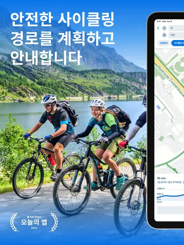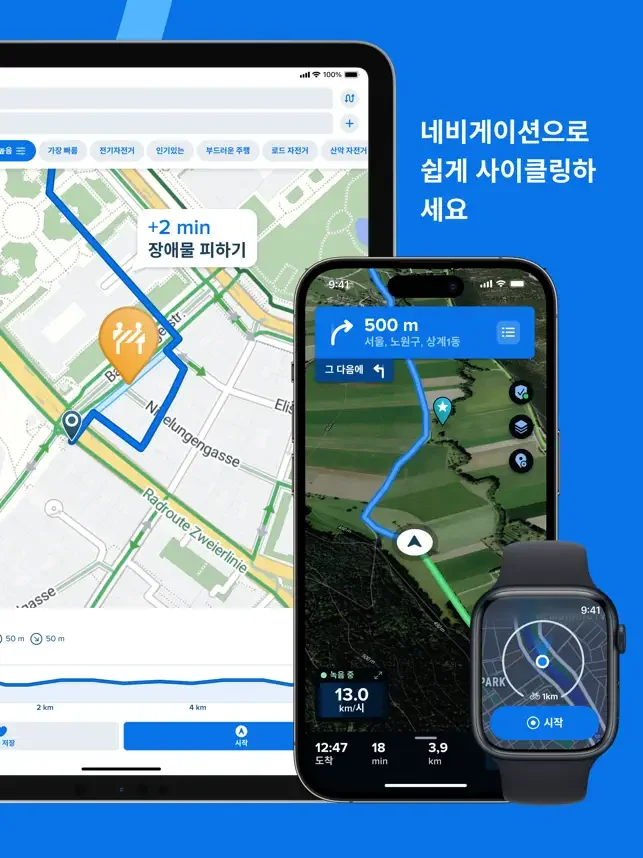 로드 자전거, 산악 자전거 또는 시티 자전거에 맞게 내비게이션을 최적화하세요. 가급적 자전거 도로에서 탐색하세요.