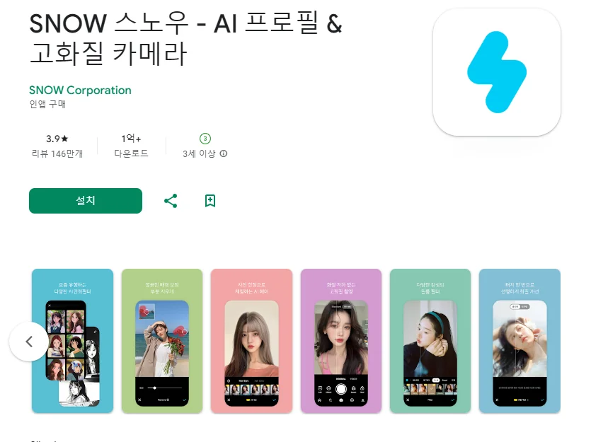 이 어플은 구글플레이스토어에서 "카메라 필터"로 검색했을때 1번째로 나오는 어플입니다. 아래는 SNOW 스노우 - AI 프로필 & 고화질 카메라 어플에 대한 자세한 설명이니 참고하세요.