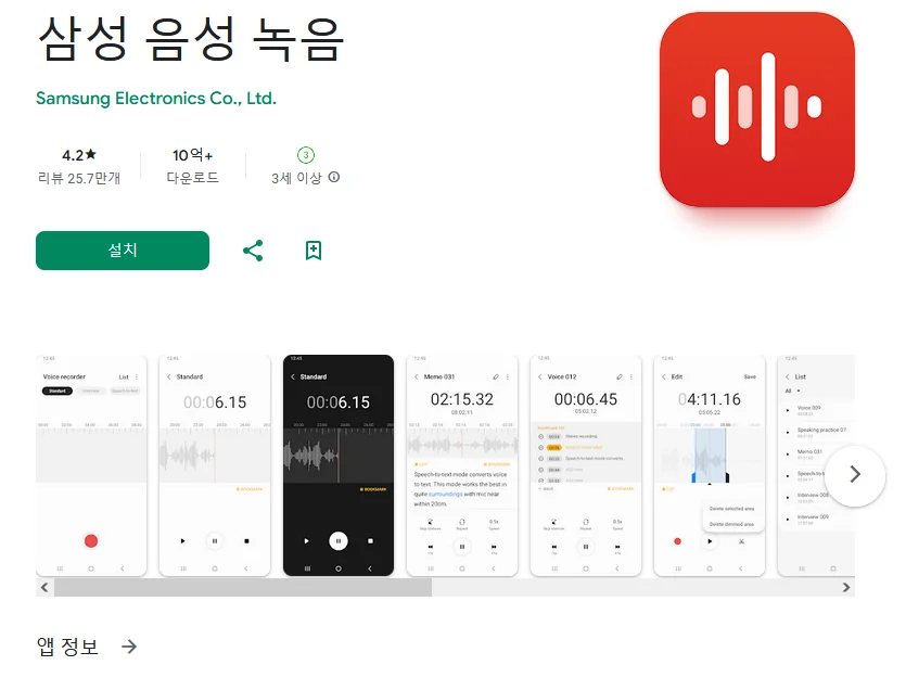이 어플은 구글플레이스토어에서 "통화 녹음"로 검색했을때 3번째로 나오는 어플입니다. 아래는 삼성 음성 녹음 어플에 대한 자세한 설명이니 참고하세요.