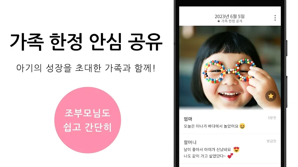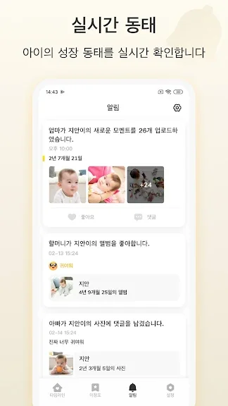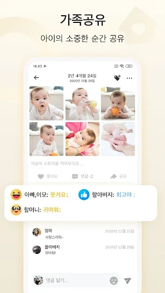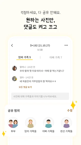 가족과의 소통을 위한 기능도 강화되었습니다. 가족을 초대하여 아기 사진에 댓글과 좋아요를 달 수 있으며, 그룹별로 관리할 수 있어 더욱 개인화된 소통이 가능합니다.